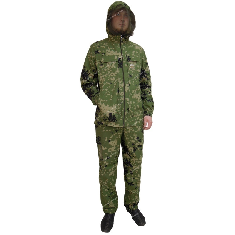 • капюшон с козырьком, по переднему краю которого пристегивается антимоскитная сетка, которая без необходимости, легко убирается в карман куртки